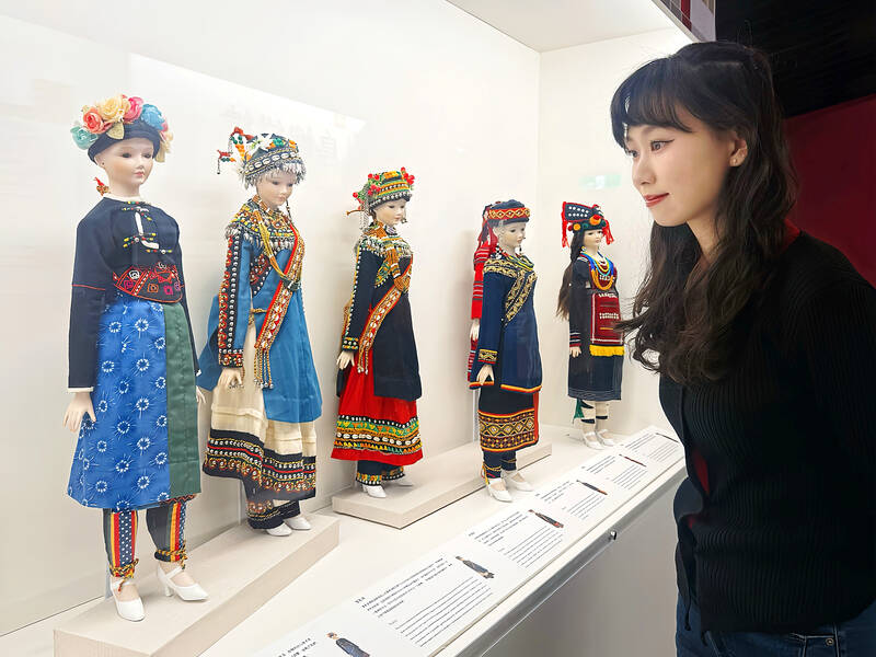 A woman looks at dolls dressed in indigenous clothing at the Shisanhang Museum of Archeology in New Taipei City’s Bali District in a photograph released yesterday. The museum’s Special Exhibition of Ancient Austronesian Clothing, which was originally scheduled to finish tomorrow, has been extended to May 10.