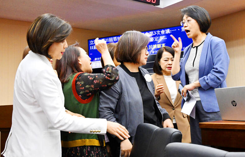 The committee adjourned amid disagreement over KMT Legislator Weng Hsiao-ling’s (翁曉玲) actions after she submitted a draft agenda to the full session instead of putting it to a vote at the meeting.