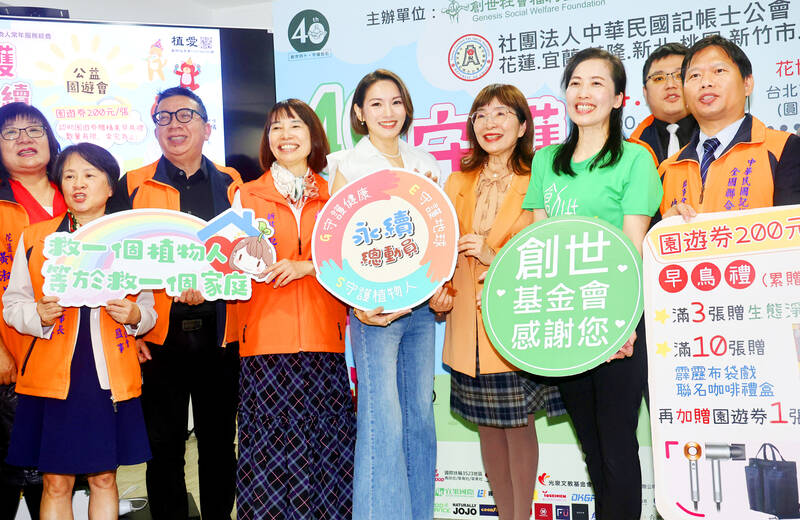 Singer Mira Lin, fifth left, holds placards along with members from the Genesis Social Welfare Foundation and the National Association of Certified Bookkeepers at a news conference in Taipei yesterday. Lin, goodwill ambassador for the foundation, urged the public to be more aware of long-term healthcare issues.