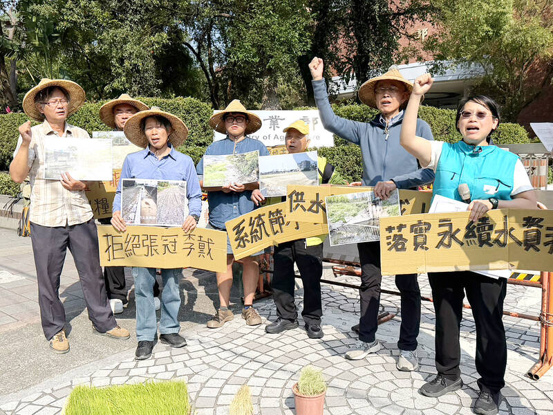 Agricultural workers from Hsinchu County yesterday gathered in front of the Ministry of Agriculture (MOA) to protest a water conservation and efficiency project that shut down water conveyance facilities without sufficient communication with farmers.