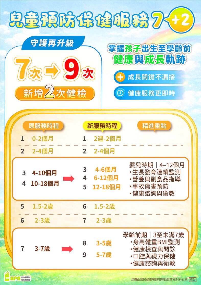 Checkups under the government-funded Children’s Preventive Healthcare Services, which provides regular checkups and consultations for children up to the age of seven, would be increased from seven times to nine times starting from July 1, the Health Promotion Administration (HPA) said yesterday.