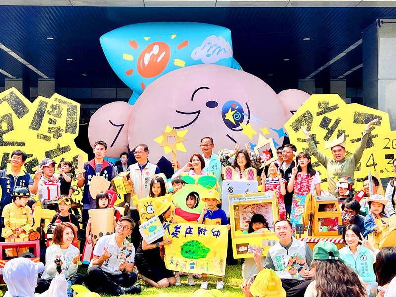 Pingtung County Commissioner Chou Chun-mi, second row, center, poses with children and local officials at the opening of a two-day festival named “Surrounding the County Government: Children Take the Lead” at the county government yesterday in celebration of Children’s Day.
