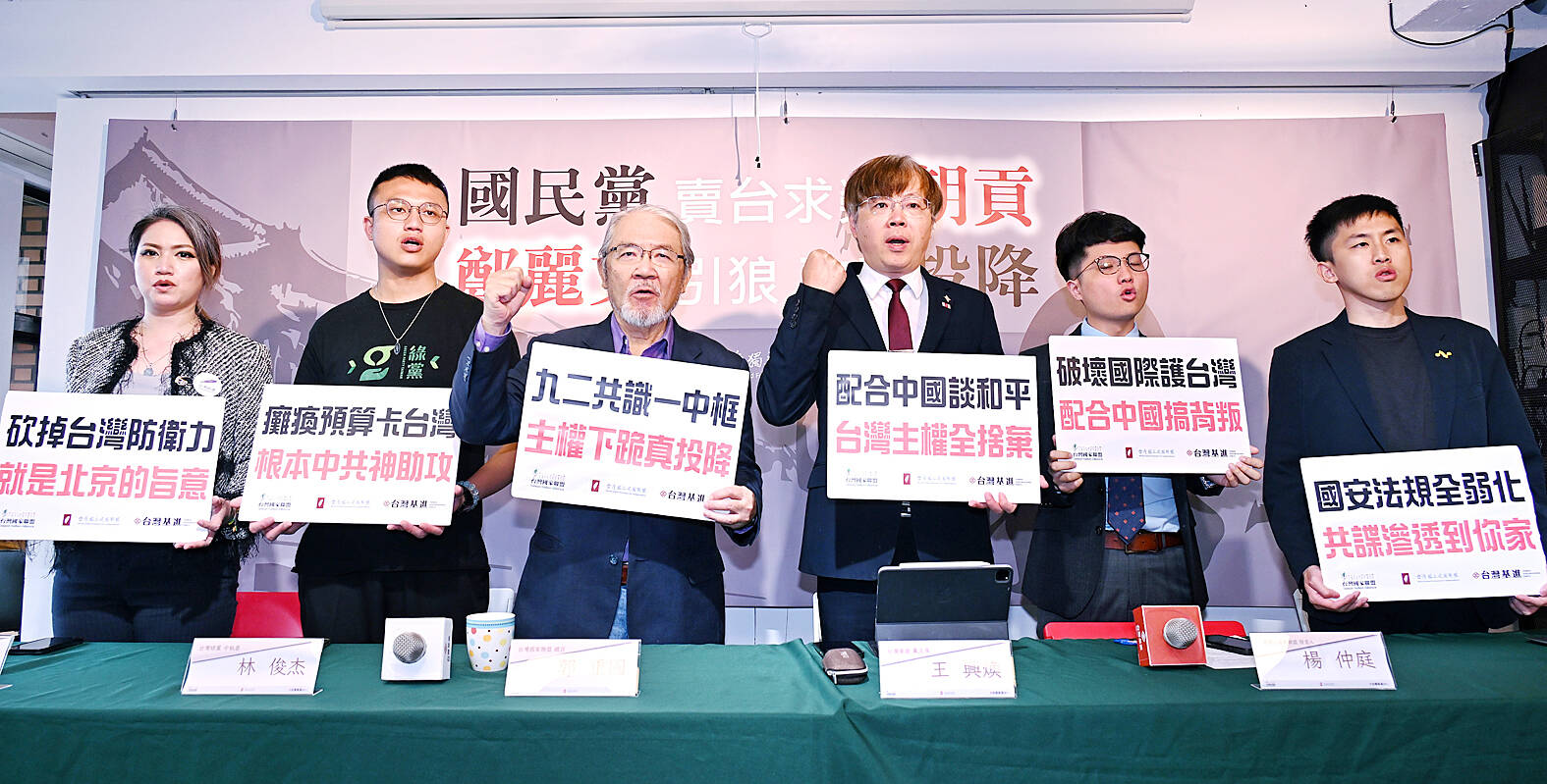 Representatives from the New Power Party, the Taiwan Statebuilding Party and civic groups hold placards at a news conference in Taipei, condemning Chinese Nationalist Party (KMT) Chairwoman Cheng Li-wun, saying that she was “insisting on becoming a model for the Chinese Communist Party’s united front tactics against Taiwan.” Cheng is slated to depart for China today on a trip that might culminate with a meeting with Chinese President Xi Jinping.