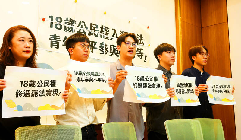 Youth rights and welfare advocates hold placards at a news conference at the Legislative Yuan in Taipei yesterday. The groups called on lawmakers across party lines to support lowering the voting age to 18 through a constitutional amendment.