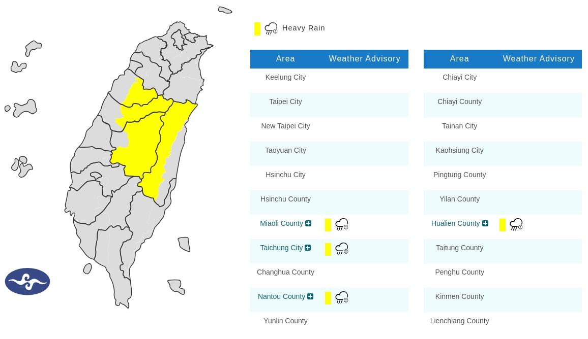 The Central Weather Administration (CWA) has issued heavy rain alerts for four cities and counties in central and eastern Taiwan, warning of short bursts of intense rainfall as convective cloud systems intensified across Taiwan.