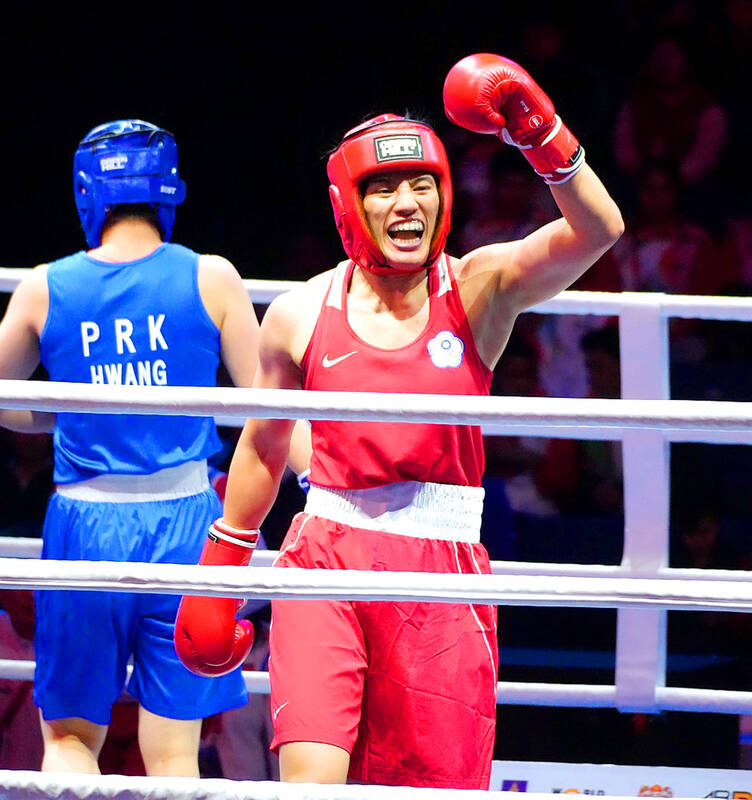 Boxer Chen Nien-chin celebrates after winning the women’s 65kg division at the Asian Boxing Elite Boxing Championship in Ulan Bator, Mongolia, yesterday. She defeated Hwang Hyo-sun of North Korea by a 4-1 split decision to secure her second Asian Championship title.