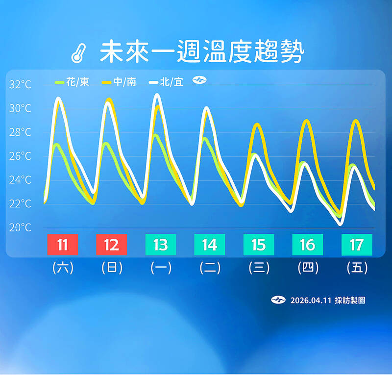 Taiwan is expected to continue to experience summer-like conditions this week with the influence of a warm, southwesterly system, the Central Weather Administration (CWA) said yesterday. With mostly sunny skies nationwide yesterday, highs were 31°C to 32°C in most areas, the CWA said. The stable weather is expected to continue this week, although humidity would increase in northern Taiwan, which would bring highs down to about 29°C on Thursday, the CWA said. Highs in central and southern Taiwan are expected to be little changed from yesterday, it said. Independent meteorologist Daniel Wu (吳德榮) urged people to take precautions against sun exposure, as ultraviolet levels are expected to be high.