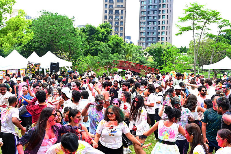People participate in this year’s Holi Festival at the Taipei Hakka Cultural Theme Park yesterday. India Taipei Association Director-General Ninad Deshpande said the event not only deepened local Taiwan-India cultural exchanges, but also built a bridge of friendship through people-to-people interactions.