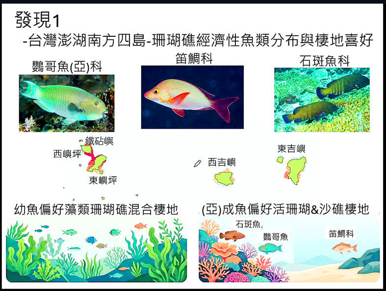 Professor of life science at the university Wen Guo-zhang (溫國彰) said his team tracked grouper, snapper and parrotfish populations near Penghu County from 2013 to 2015, and in 2023 and last year.