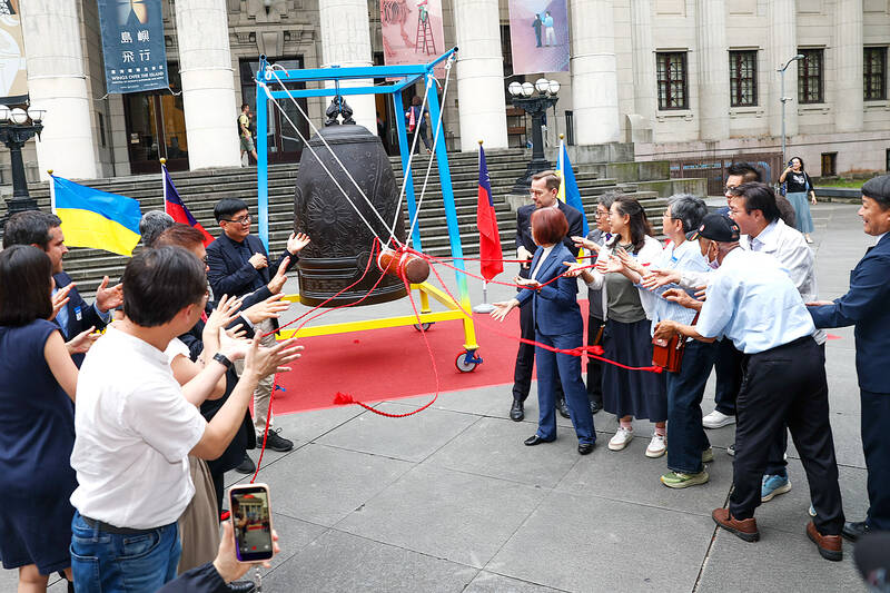 A humanitarian peace initiative titled “Let the Bell of Peace Ring from Taiwan” is unveiled at the plaza in front of the National Taiwan Museum in Taipei yesterday. Event guests were invited to ring the peace bell together. The bell stands 2.86m tall, weighs 1.5 tonnes and is engraved with Ukraine’s national flower, the sunflower, as well as a dove symbolizing peace. The project’s initiator, Taiwanese-American artist Lin Shih-pao, said the bell is scheduled to tour in Taoyuan, the US and other locations, with Ukraine as its final stop.