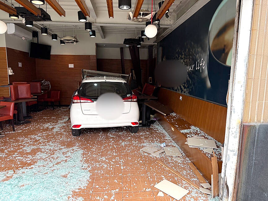 A man died after a car driven by a 71-year-old woman crashed into a coffee shop in Miaoli County’s Toufen Township (頭份) yesterday morning while turning into a parking space, police said.