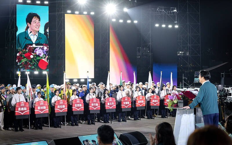 President William Lai, at the podium, speaks at the opening ceremony of the National Middle School Athletic Games in the Chiayi County Baseball Stadium yesterday. Lai encouraged the athletes to bravely challenge themselves and push beyond their limits. More than 20,000 athletes are competing in 21 categories in this year’s Games.