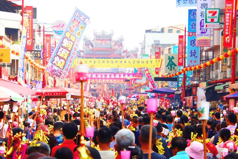 People accompanying a palanquin bearing a statue of the goddess Matsu arrive at Fongtian Temple in Chiayi County’s Singang Township yesterday. The nine-day, 340km pilgrimage, which starts and finishes at Jenn Lann Temple in Taichung’s Dajia District, takes place each year around the deity’s birthday during the third month on the lunar calendar.