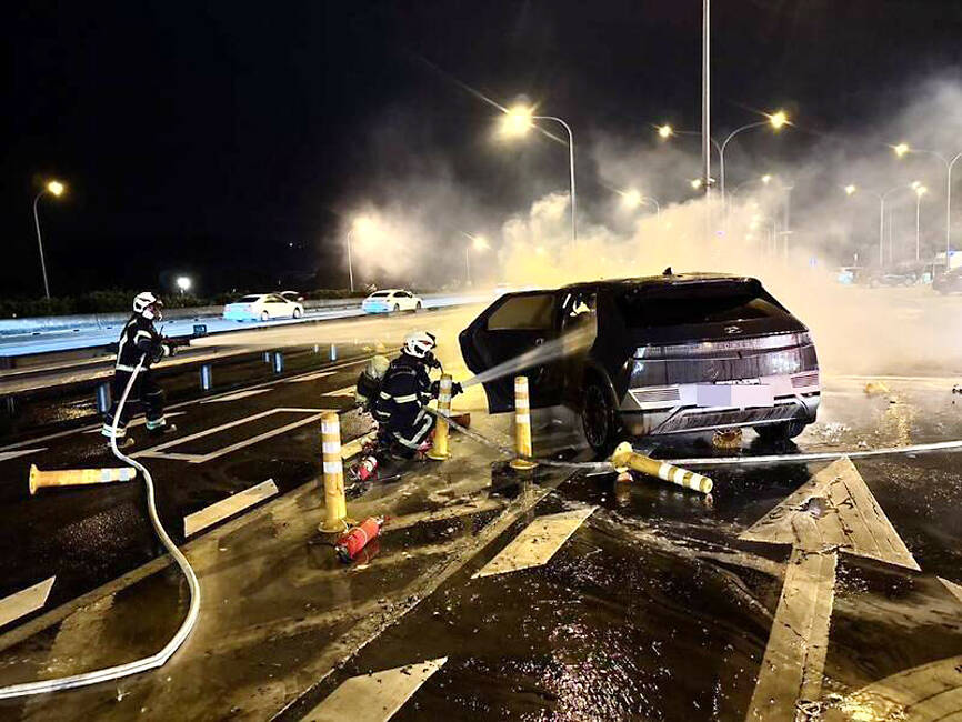 The electric vehicle caught fire after hitting a median island on the road leading to the Yangmei Service Area, killing four people and severely injuring four.
