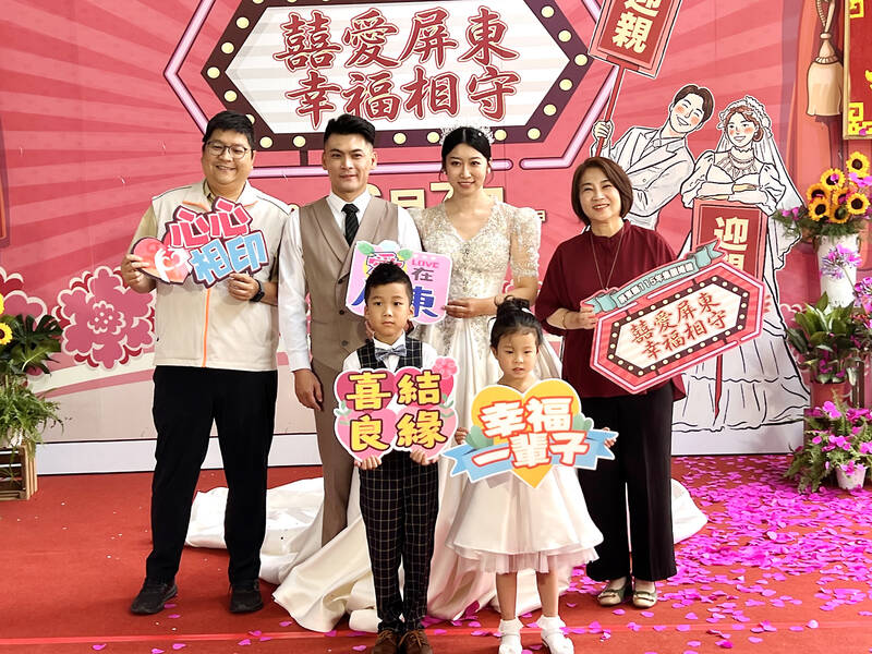 Pingtung County Commissioner Chou Chun-mi, right, holds placards with models in a mock wedding at a news conference in Pingtung County yesterday, promoting the county government’s annual mass wedding event, which is to take place on June 7. This year’s event, themed “Love in Pingtung, Happiness Together,” offers newlyweds NT$10,000 shopping vouchers and professional wedding styling services, and a chance to win honeymoon tickets to Tokyo and Seoul, along with hotel vouchers and home appliances worth NT$60,000, the county government said.