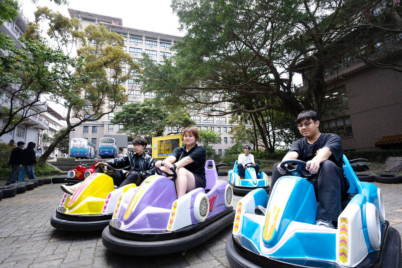 People ride bumper cars at Chinese Culture University’s Youth Carnival in Taipei yesterday. The event features amusement park attractions such as bumper cars, a ball pit, a real-life claw machine and street performances. It runs through tomorrow. The university invited students, faculty and the public to “explore the campus grounds and reconnect with their childlike wonder.”