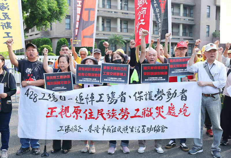 Representatives from the Taiwan Association of Victims of Occupational Injuries and the Keelung Indigenous Peoples Mutual Aid Association hold a banner and signs at a news conference in front of the Executive Yuan in Taipei yesterday, calling on the government to address the occupational injuries faced by indigenous workers.