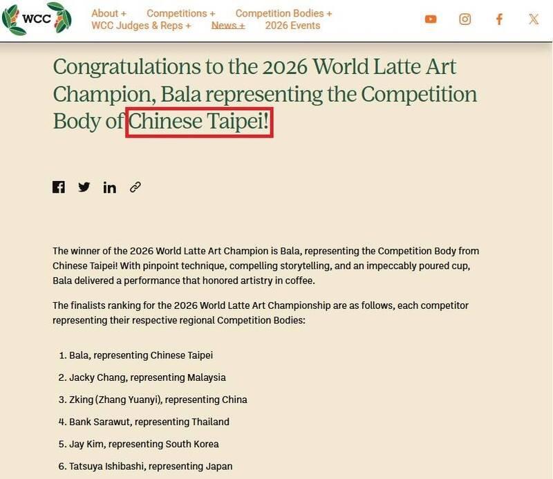 When Bala won the World Latte Art Championship in San Diego earlier this month, he was referred to as representing Taiwan on the WCC’s Web site until yesterday, when it was changed to “Chinese Taipei.”
