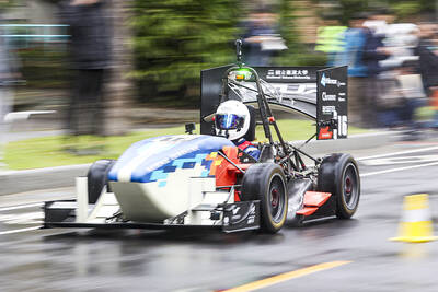 A National Taiwan University student drives the Epsilon 6 race car down the university’s Palm Avenue yesterday. The Epsilon is a line of student-built, all-electric racing cars which may be used to enter competitions such as the Formula SAE.