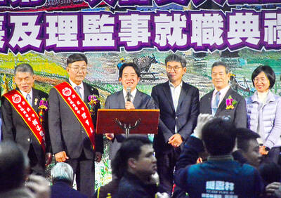 President William Lai, third left, addresses the audience at a gathering hosted by the New Taipei City Yunlin Association in New Taipei City yesterday. In his speech, Lai called on members of the association — consisting of people from Yunlin County who live in New Taipei City — to support Democrati