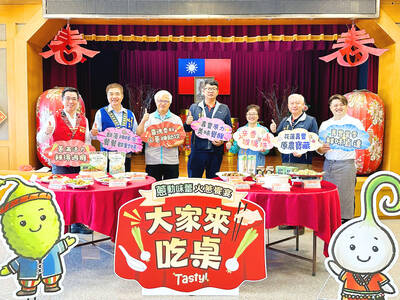 Shoufeng Township Farmers’ Association officials hold placards at a news conference in Hualien yesterday promoting a specialty banquet to be held on April 18. Fire onions — a distinctive Amis crop in the township, which are in season — would be featured in the banquet.