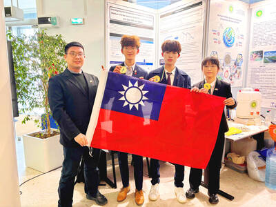 National Chiayi Senior High School students hold the national flag and gold medals at a scientific fair in Italy in an undated photograph. The team won gold for their research on the interstellar medium at the scientific fair held by the Italian Federation of the Scientific and Technical Association
