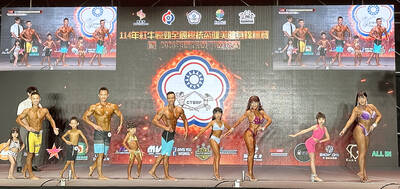 Competitors participating in the family category flex at the 2025 National Bodybuilding Championship at the New Taipei Sinjhuang Gymnasium yesterday. The event, promoting a government policy encouraging the public to take up sports, attracted more than 300 participants this year, the Chinese Taipei