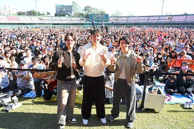 Uni-President 7-Eleven Lions slugger Lin An-ko, center, gestures at a gathering with fans at the Tainan Municipal Baseball Stadium yesterday. The team sponsored the event for Lin ahead of his departure to Japan to play for the Saitama Seibu Lions in the Nippon Professional Baseball league. The Uni-P