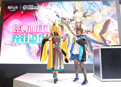 Two cosplayers pose for a photograph during a news conference in Taipei yesterday, ahead of the opening of the Taipei Game Show today.