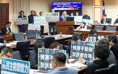 Democratic Progressive Party lawmakers, seated, and opposition lawmakers, standing around the podium, hold placards to make known their stances on a proposed special defense budget during a meeting of the legislature’s Procedure Committee in Taipei yesterday.