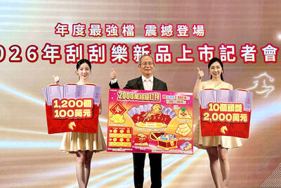 Taiwan Lottery Co yesterday launched five new scratch-off games to mark the Lunar New Year, featuring a top prize of NT$20 million (US $632,483).The annual "NT$20 Million Super Red Envelope" (2000 萬超級紅包), the most popular Lunar New Year scratch game, offers 10 top prizes of NT$20 million each and