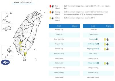 The Central Weather Administration (CWA) today issued a heat advisory for parts of southern Taiwan, warning of daytime temperatures as high as 36°C.In southeastern areas, the mercury might soar past 36°C due to foehn winds — hot, dry gusts that come down the leeward side of the mountain range, the C