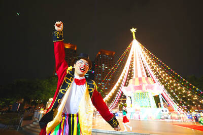 A performer raises a fist in the air during the opening of this year’s Christmasland in New Taipei City’s Banciao District yesterday. The event, themed “Circus Carnival” and featuring Line Friends, is to end on Dec. 28.