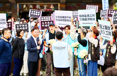 Regulators should punish airlines that contravene labor standards by penalties up to the loss of flying rights, flight attendant unions said in a protest at the Civil Aeronautics Bureau in Taipei yesterday.More than 100 union members participated in the event organized by the Taoyuan Flight Attendan