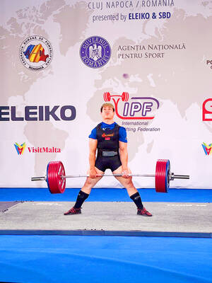Taiwanese powerlifter Chiang Kai-chieh competes in the men’s 83kg event at the International Powerlifting Federation World Open Equipped Powerlifting Championships in Romania on Wednesday. He won gold with a deadlift of 332.5kg.