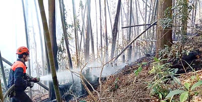 A forest fire that broke out in Yunlin County’s Gukeng Township (古坑) early on Monday has been brought under control, but continued to burn sporadically yesterday as firefighting teams struggled with the area’s harsh terrain and lack of water.The Yunlin County Fire Department yesterday said that the