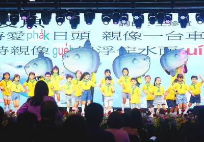 The Puzangalan Children’s Choir, made up of students from Lai Cuo Elementary School in Taichung, perform at the Corporate Maritime Sustainability Award ceremony in Taipei yesterday. Vice President Hsiao Bi-khim, not pictured, attended the ceremony, hosted by the Ocean Affairs Council, to confer awar