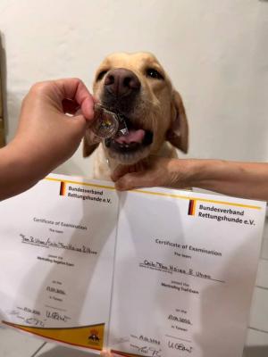 Taichung police dog Uhoo on Friday last week passed two advanced man-trailing (MT) tests administered by the German rescue dog association Bundesverband Rettungshunde (BRH), becoming one of two working dogs in Taiwan to obtain this high-level international certification.Uhoo was pictured biting his