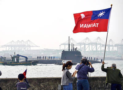 Taiwan’s first indigenous submarine, the Hai Kun (海鯤), or “Narwhal,” continued sea trials yesterday, drawing many naval enthusiasts to Kaohsiung’s waterfront.People were spotted waving the Taiwanese flag and holding banners to show support for the submarine project.The submarine sailed out to sea fr