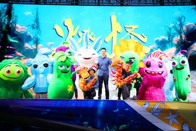 Jhubei City Mayor Cheng Chao-fang, center, poses with the Paper Windmill Theatre troupe while visiting West Park in Hsinchu County, which is hosting a children’s carnival from today to Sunday. The troupe’s Hakka-language performance, Den Guai, is about environmental protection and coexisting with na