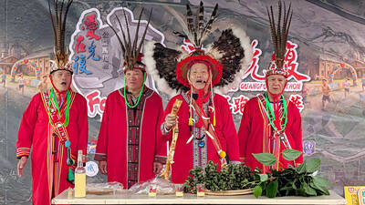 Indigenous chiefs perform a blessing ritual at the opening of the “Love in Guangfu” road race in Hualien County’s Guangfu Township yesterday.