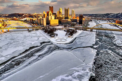 Ice covers the confluence of the Allegheny, left, Ohio, center, and Monongahela rivers at the Point State Park in downtown Pittsburgh, Pennsylvania, on Wednesday, when temperatures reached a low of minus-16°C. The City of Bridges got a record-setting 28cm of snow on Sunday, which is likely to stick