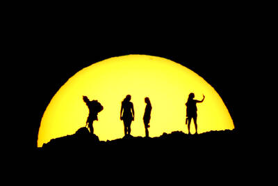 Hikers are silhouetted against the setting sun at Papago Park in Phoenix, Arizona, on Wednesday. The desert park, known for its distinctive geological formations, is home to a pyramid tomb built by the state’s first governor for his wife and the home of former US Supreme Court justice Sandra Day O’C