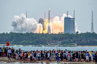 Part of a huge rocket that launched China’s first module for its Tianhe space station is falling back to Earth and could make an uncontrolled re-entry at an unknown landing point. The 30m-high core of the Long March 5B rocket on Thursday launched the “Heavenly Harmony” uncrewed core module into low Earth orbit from Wenchang in China’s Hainan Province. The Long March 5B then itself entered a temporary orbit, setting the stage for one of the largest-ever uncontrolled re-entries. Some experts fear it could land on an inhabited area. “It’s potentially not good,” said Jonathan McDowell, astrophysicist at the Astrophysics Center at Harvard University. “Last time they launched a Long March 5B rocket they ended up with big long rods of metal flying through the sky and damaging several buildings in the Ivory Coast,” he said. “Most of it burned up, but there were these enormous pieces of metal that hit the ground. We are very lucky no one was hurt.” Yesterday, the core was orbiting Earth about every 90 minutes at about 27,600kph and an altitude of more than 300km. The US military has named it 2021-035B and its path can be seen on Web sites including orbit.ing-now.com. Since the weekend it has dropped nearly 80km in altitude and SpaceNews reported that amateur ground observations showed it was tumbling and not under control. This, and its speed, makes it impossible to predict where it will land when Earth’s atmosphere eventually drags it down, although McDowell said the most likely outcome is that it will fall into the sea, as the ocean covers about 71 percent of the planet. However, McDowell said some pieces of the rocket would survive re-entry and that it would be the “equivalent of a small plane crash scattered over 100 miles [161km].” Since 1990 nothing more than 10 tonnes has been deliberately left