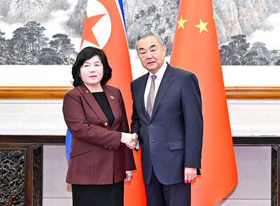 Beijing wants to strengthen cooperation with Pyongyang and work together to oppose hegemony, Chinese Minister of Foreign Affairs Wang Yi (王毅) told his North Korean counterpart, in a thinly veiled reference to the US.North Korean Minister of Foreign Affairs Choe Son-hui met Wang on Sunday in the Chin