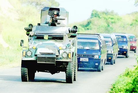 Escorting the convoy south yesterday morning were an armored personnel carrier, an armored car mounted with machine guns and manned by soldiers and an armoured police truck.