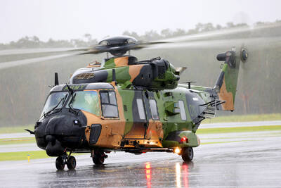 SEARCH CONTINUES: Specialist divers have joined the hundreds-strong search for the crew, who were from the Sixth Aviation Regiment based in Sydney, officials said Australia’s military is to ground its fleet of MRH-90 Taipan helicopters after a crash during multinational military exercises that left four crew members missing, the army chief said yesterday. The helicopter crashed into waters near the Whitsunday Islands off Australia’s subtropical northeast late on Friday, sparking a search by the militaries of three nations, but hopes of finding the missing crew were fading. Australian Chief of Army Lieutenant General Simon Stuart said that the military would ground its fleet of about 45 Taipan helicopters. “We are not flying the MRH-90 today and won’t until we think it is safe to do so,” Stuart