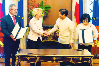 MANILA TALKS: The European Commission president renewed the EU’s recognition of a decision by a UN-backed tribunal that invalidated Beijing’s claims in the South China Sea European Commission President Ursula von der Leyen yesterday said that Europe would not tolerate aggression in Ukraine or the Indo-Pacific region, as she renewed in a speech the EU’s recognition of a 2016 arbitration decision that invalidated China’s expansive claims in the disputed South China Sea. Von der Leyen spoke at a joint news conference with Philippine President Ferdinand Marcos Jr after holding talks in Manila that aimed to bolster trade, economic and security relations. The leaders announced the 27-nation bloc would resume negotiations with the Philippines for a free-trade agreement that stalled in 2017 under Marcos’ predecessor, former Philippine president