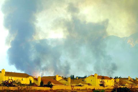 Winds pushed embers ahead of the fire mass, adding to the pall of smoke from a 6,400-hectare fire about 19km away in the Rancho Cucamonga area.