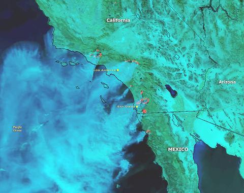 Burning from Tijuana, across the Mexican border, to more than 100km north of Los Angeles, they are the worst conflagrations California has seen for 50 years. Mexican authorities said that two had died in northern Baja California.